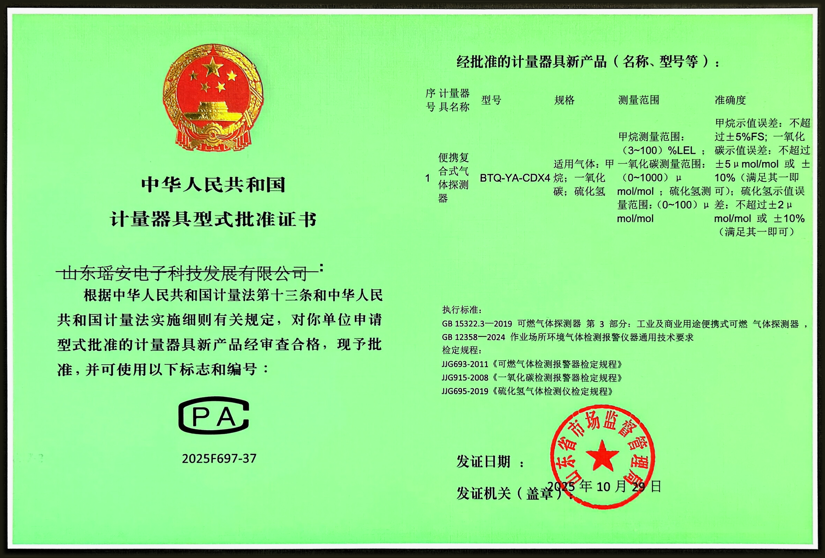 GTYQ-YA-D300F 甲烷 计量器具型式批准证书