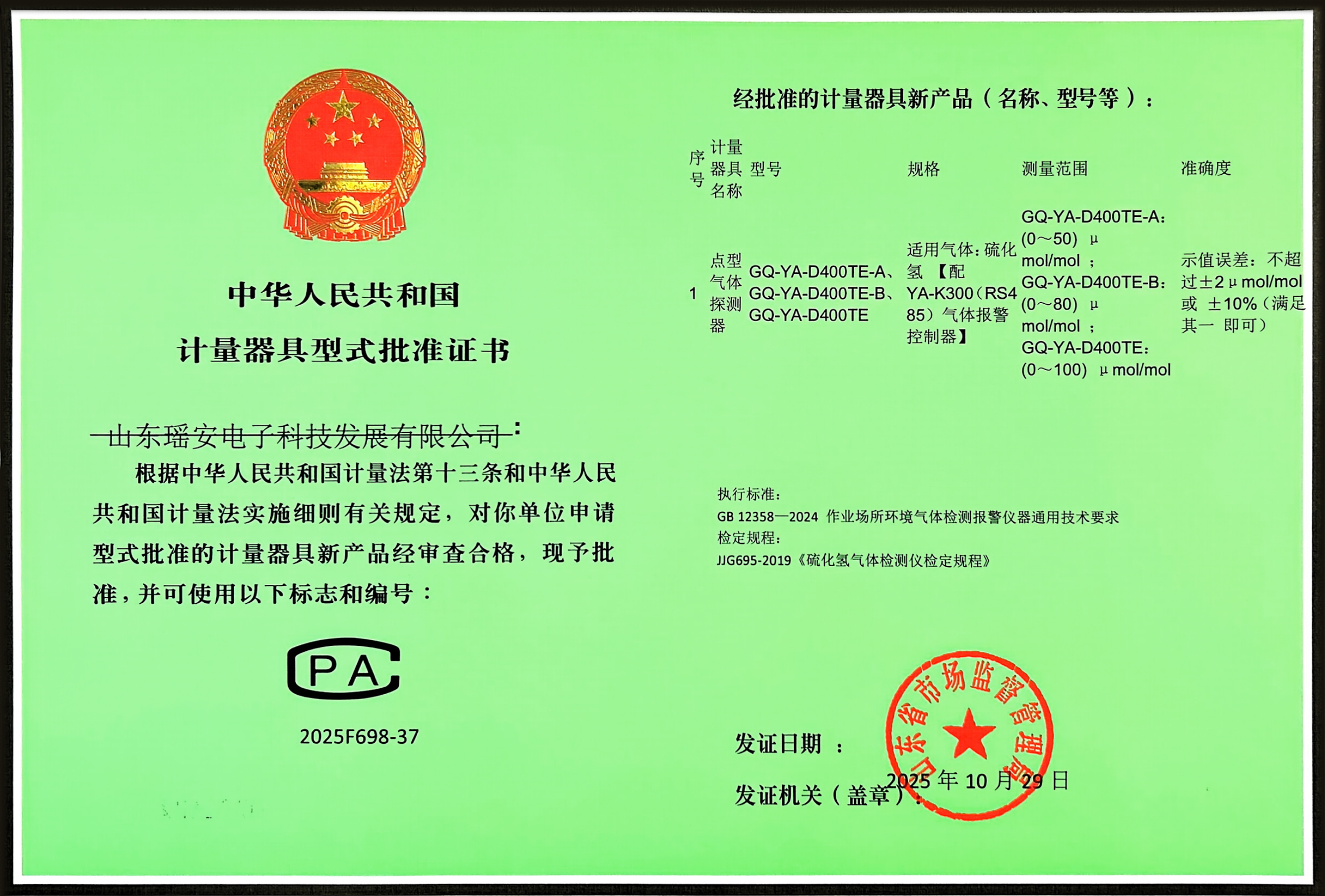 YA-D200 点型气体探测器 硫化氢 计量器具型式批准证书